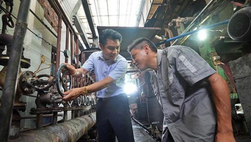謝運良(左)指導殘疾工友傅相日使用工廠設備。