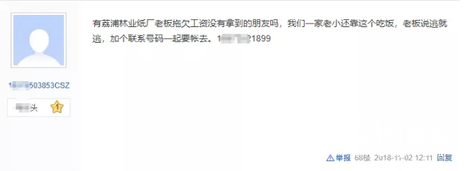 還有員工在百度荔浦吧上發帖,呼吁同事一起要帳去。“有荔浦林業紙廠老板拖欠工資沒有拿到的朋友嗎,我們一家老小還靠這個吃飯,老板說逃就逃,加個聯系號碼一起要帳去。”該員工的一席話,令這個紙業寒冬憑添了幾分寒意。