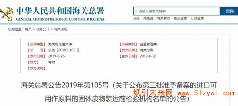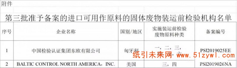 紙引未來網訊 造紙企業注意了!6月26日,海關總署公布了第三批準予備案的進口可用作原料的固體廢物裝運前檢驗機構名單。