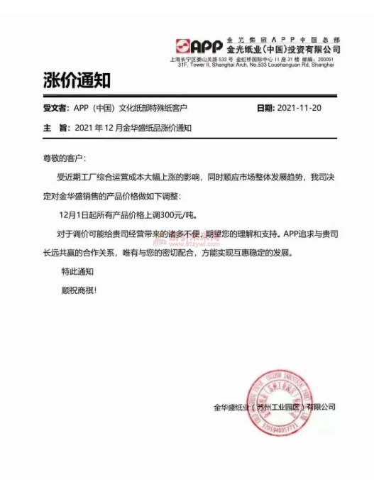 APP文化用紙:我司自2021年12月1日起,針對金東、金海所生產的全系列各紙種、克重紙品價格在2021年11月基礎上調漲300元/噸(含稅)。