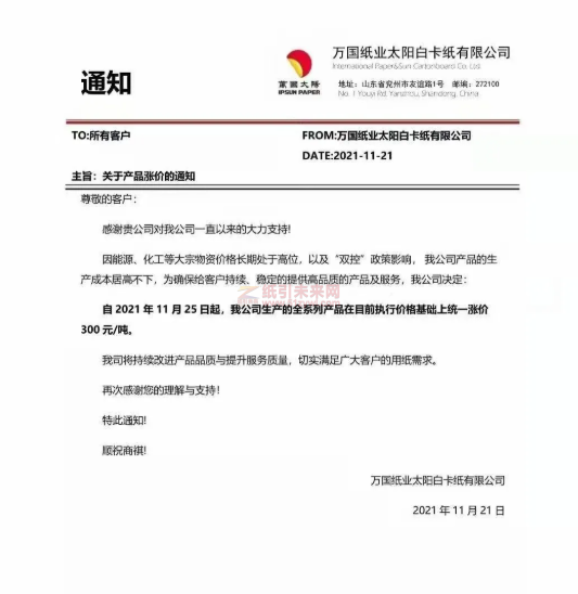 萬國紙業太陽白卡紙:自2021年11月25日起,我公司生產的全系列產品在目前執行價格基礎上統一漲價300元/噸。